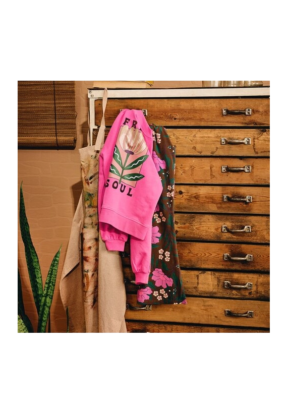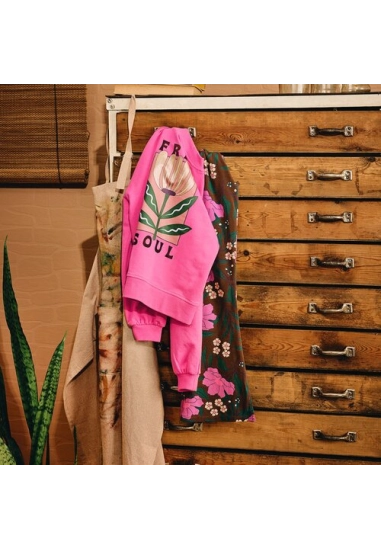 Verkrijgbaar in de kleur bruin met fel gekleurde bloemen.