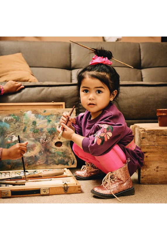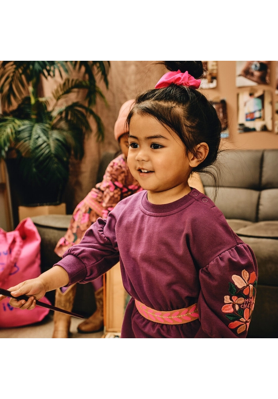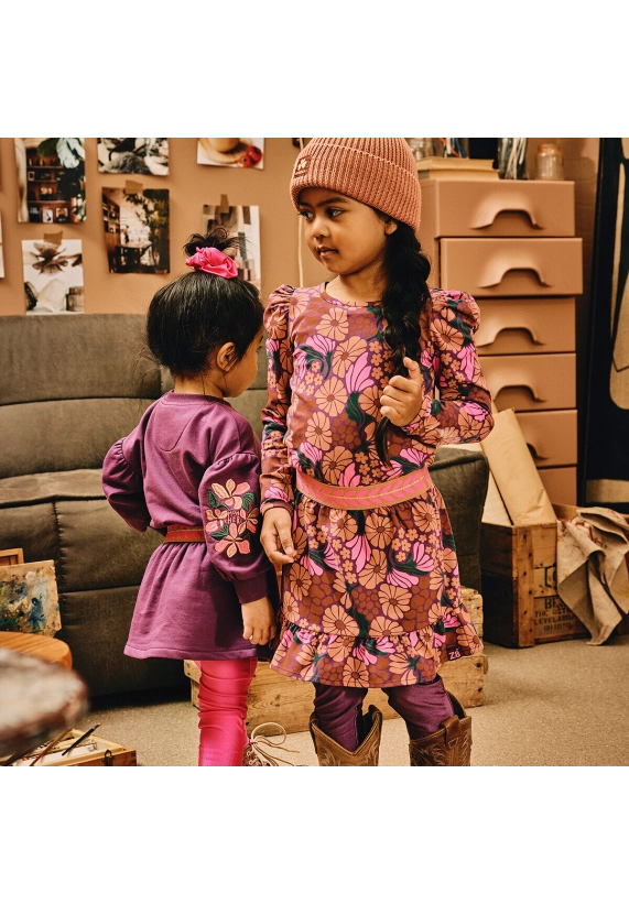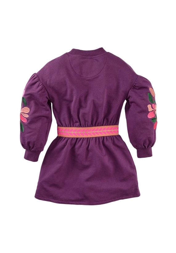 Elastieken band in de taille en ballonmouwen met geborduurde bloemen er op.