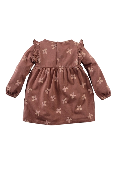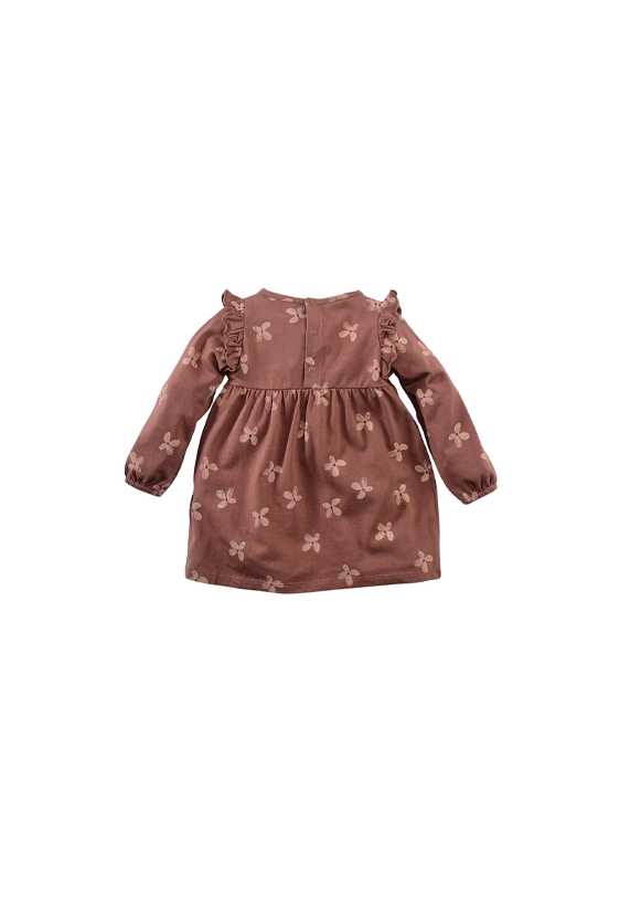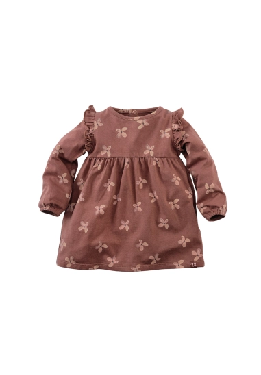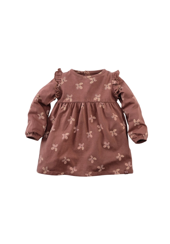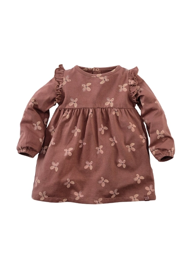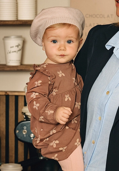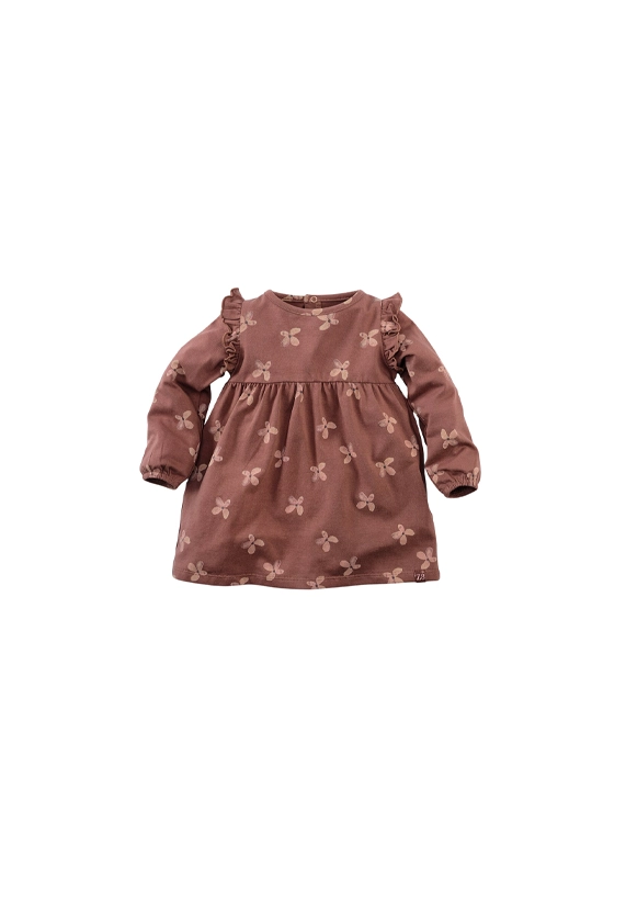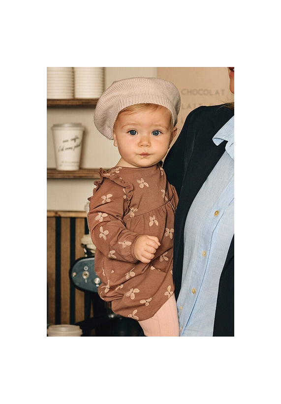 Verkrijgbaar in de kleur bruin met een all-over print van kleine aquarel bloemetjes in de kleur roze.