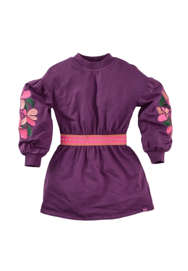 Elastieken band in de taille en ballonmouwen met geborduurde bloemen er op.