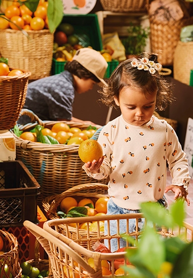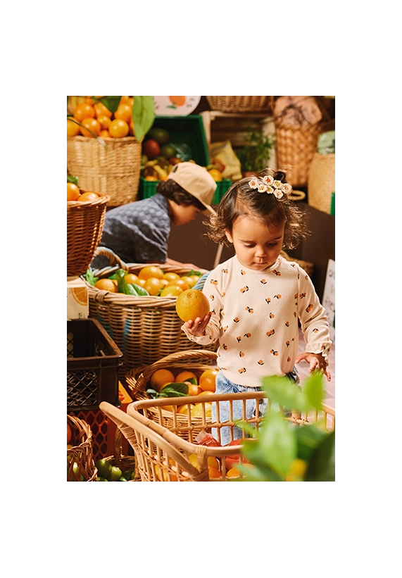 Verkrijgbaar in de kleur ivoor wit met allover print sinsasappels.