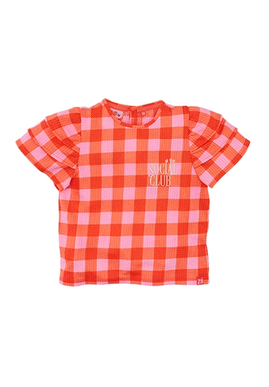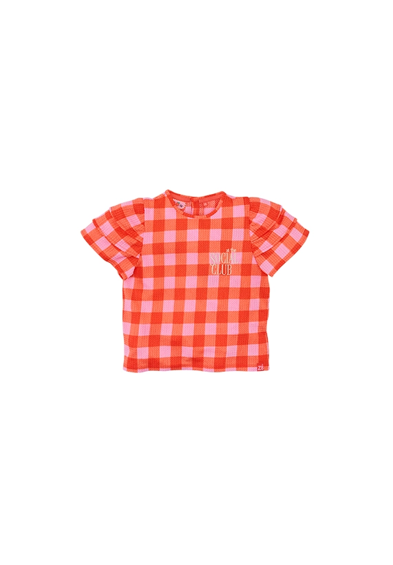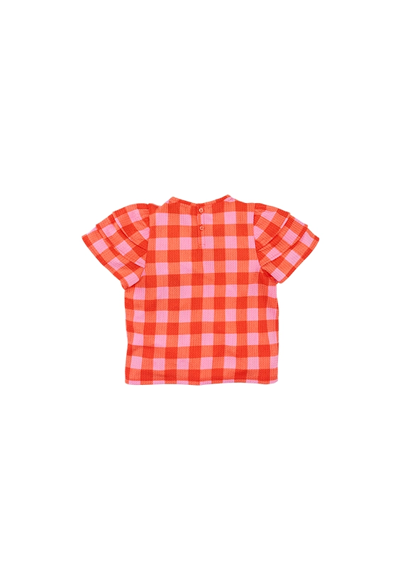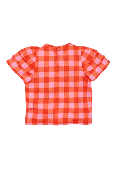 Deze geruite schoonheid heeft opvallende mouwtjes met maar liefst drie ruffle lagen.