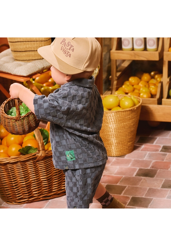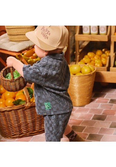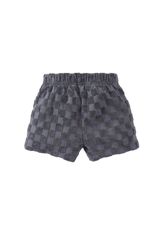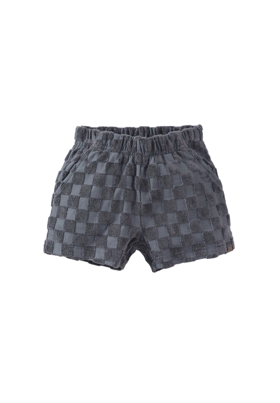 Verkrijgbaar in de kleur donkergrijs met allover blokprint.