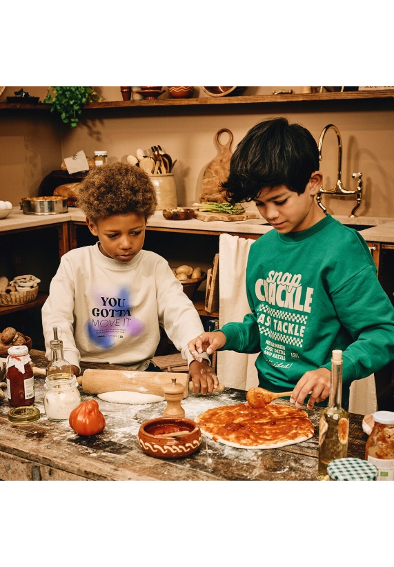 Met een grote print op het voorpand.