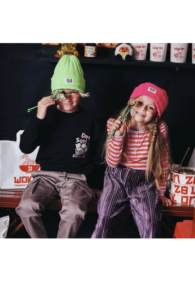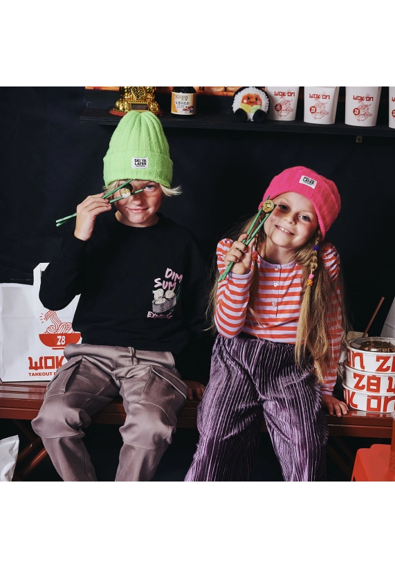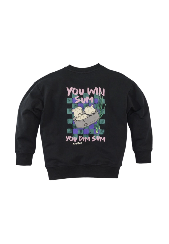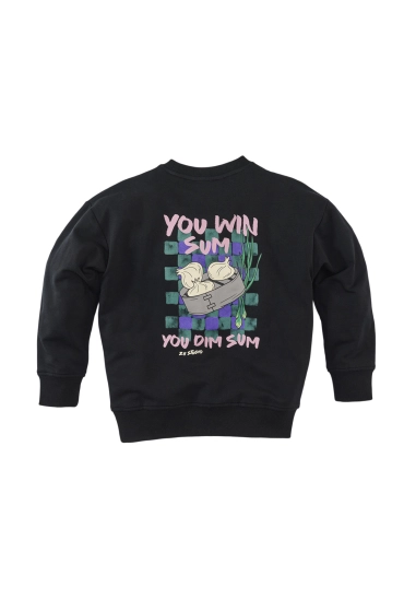 De Z8 Nikko sweater is een stoere oversized trui voor jongens. Op de voorkant staat een kleine print, terwijl de achterkant opvalt met een grote, kleurrijke dim sum-print en de tekst You Win Sum, You Dim Sum.