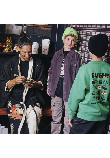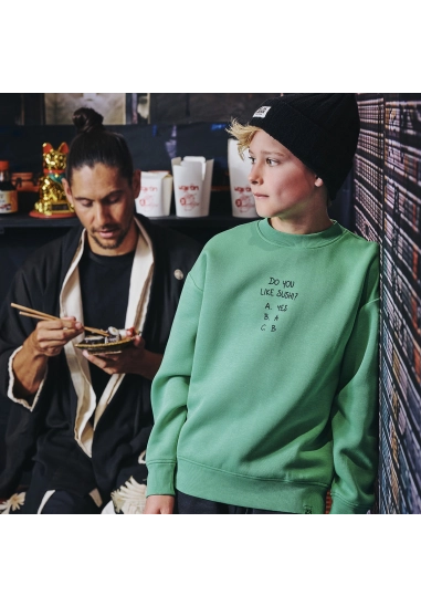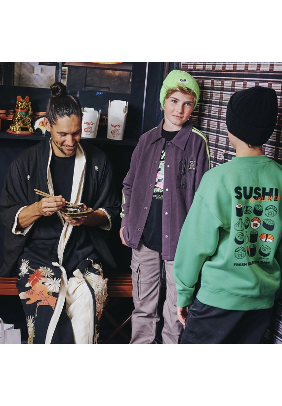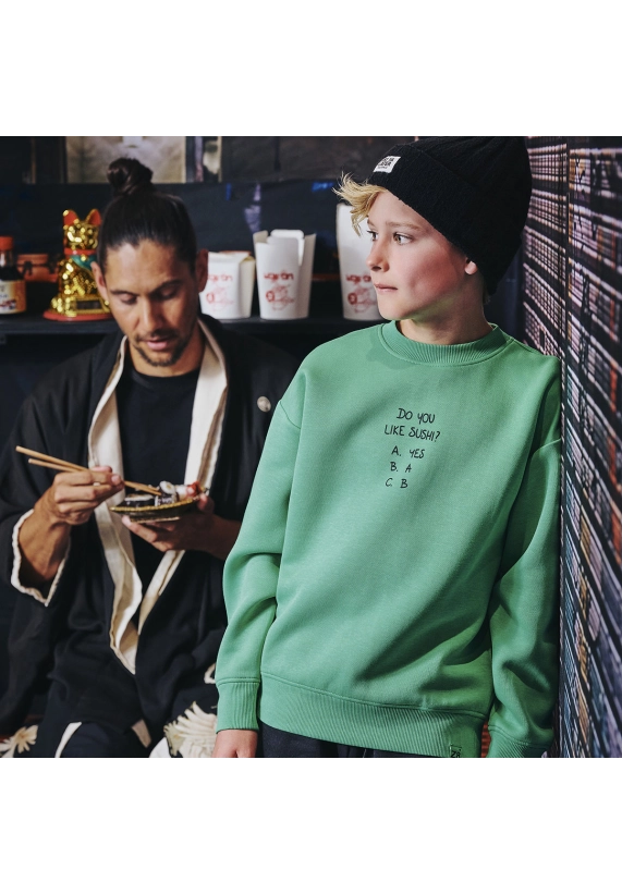 De Z8 Misja sweater is een stoere trui voor jongens. Aan de voorkant staat een klein embleem, terwijl de achterkant opvalt met een gave sushi-print. Ideaal voor school, buitenspelen of relaxen thuis.
