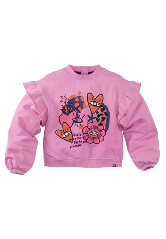 De Z8 Charelle sweater is vrolijk, comfy en stijlvol. Deze meisjes sweater in sorbet pink valt op door de speelse print op de voorkant en de schattige ruffles op de mouwen. De ronde hals en elastiek aan de mouwuiteinden zorgen voor een comfortabele pasvorm.