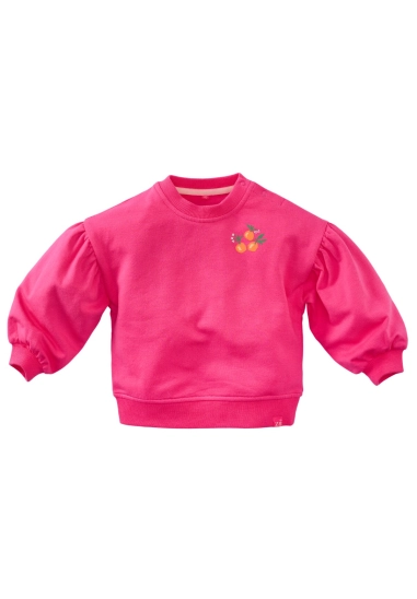 Ronde hals en lange mouw. Pofmouwen en met elastieken boord bij de mouwen.