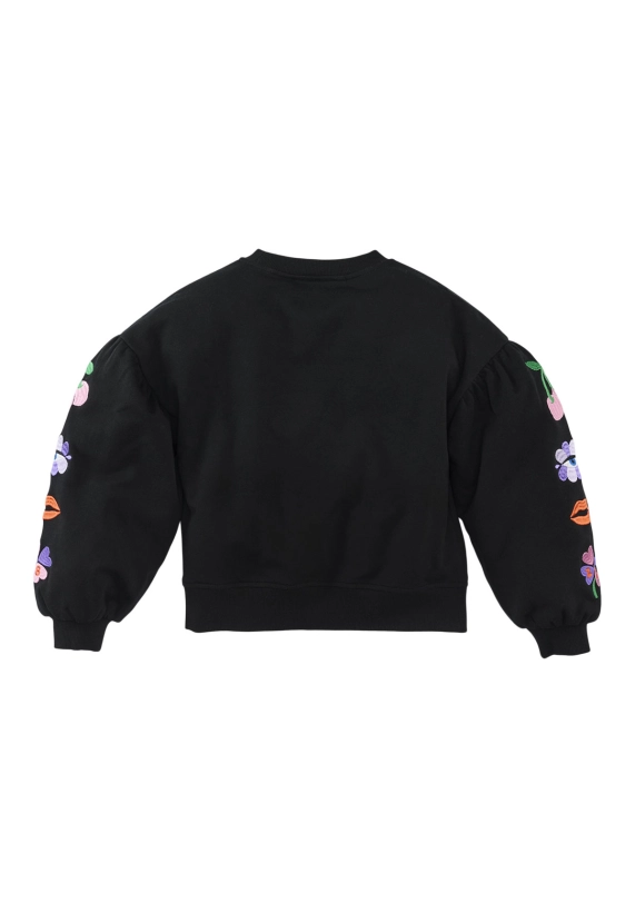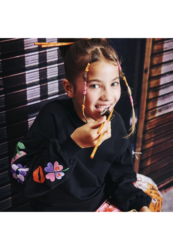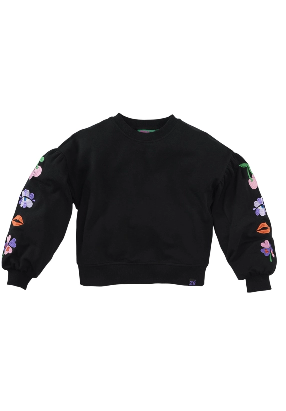 De Z8 Zahara sweater is een stoere zwarte meisjestrui met opvallende pofmouwen en vrolijke borduursels zoals bloemen, kersen en lipjes. De kleur Night Sky geeft de sweater een tijdloze uitstraling, terwijl de kleurrijke borduursels zorgen voor een speelse twist.
