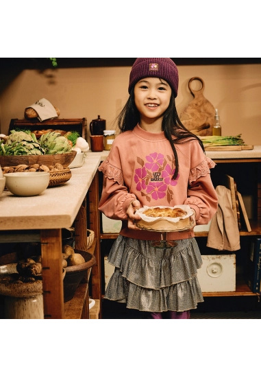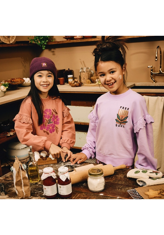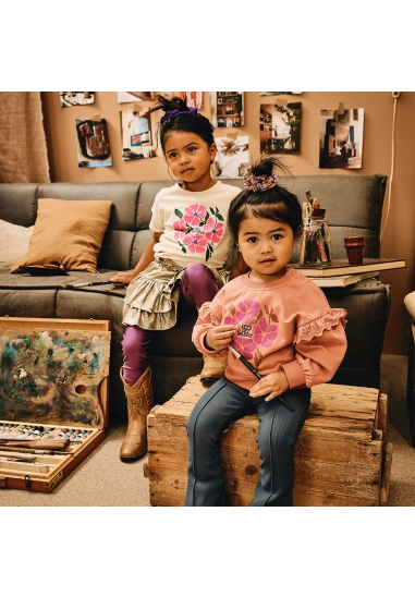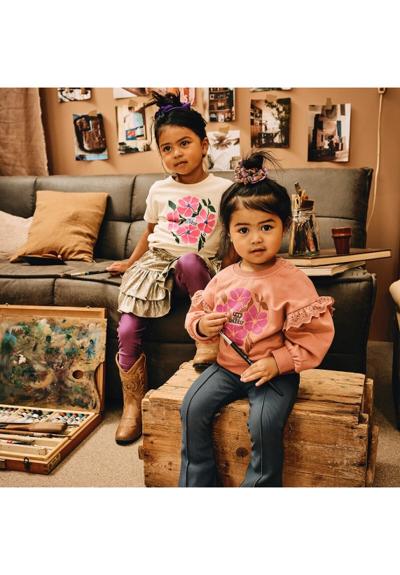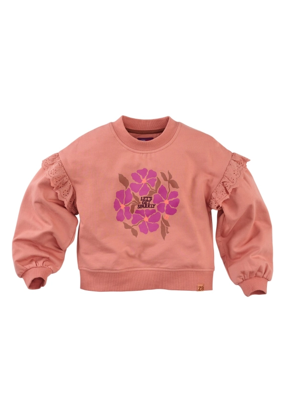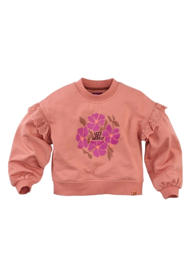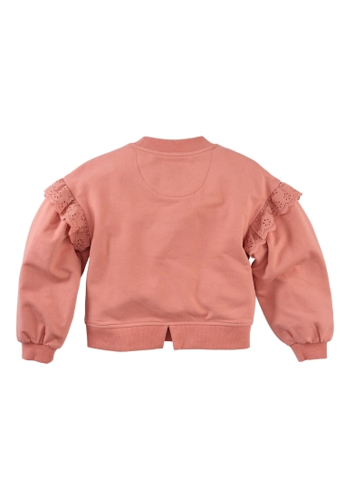 Gemaakt van zachte sweat stof en is afgewerkt met een broderie ruffle op de bovenarmen.