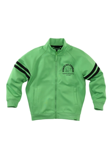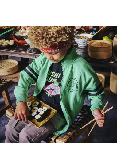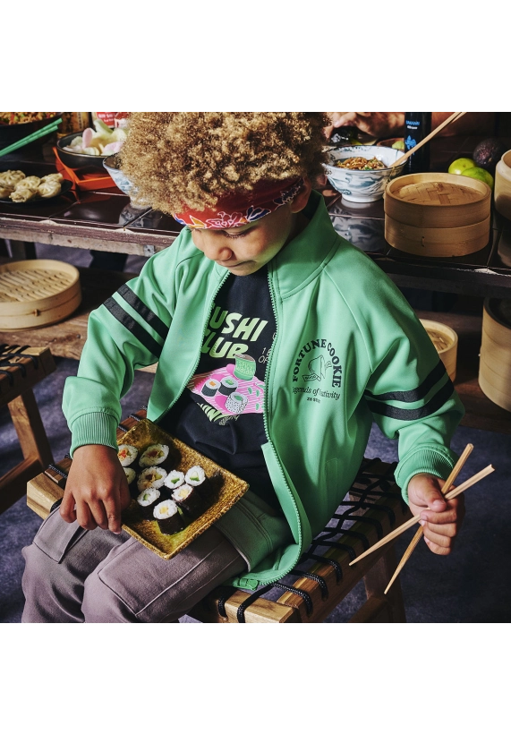 Het Finch track jacket is een echte eyecatcher voor jongens die houden van een sportieve look met een speelse twist. Dit vest heeft een stoere rits aan de voorkant, opvallende strepen op de mouwen en een coole fortune cookie-print op de borst.
