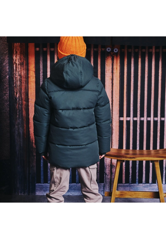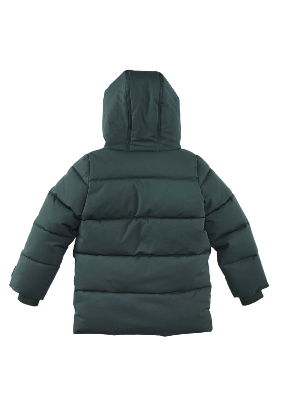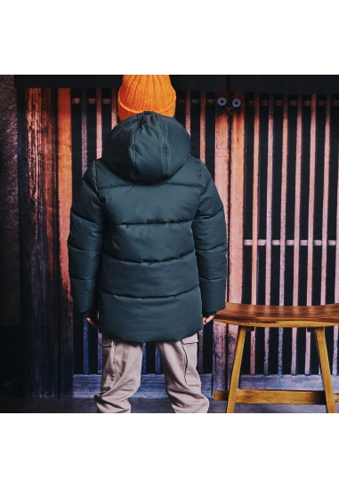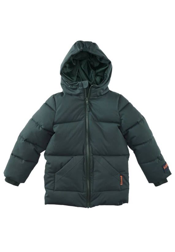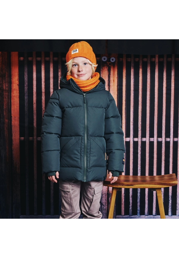 De winterjas is uitgevoerd in de kleur whispering woods een stoere, diepe groentint die makkelijk te combineren is met elke outfit. Dankzij het tijdloze design en de stevige kwaliteit is dit de perfecte jas voor schooldagen, buitenspelen of een winterse wandeling.