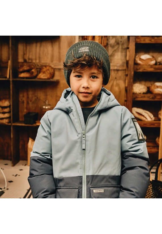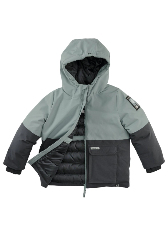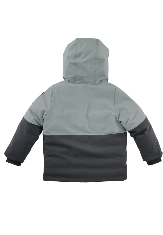 De jas bestaat uit twee kleuren licht grijs en donkergrijs.