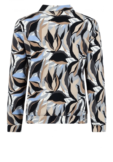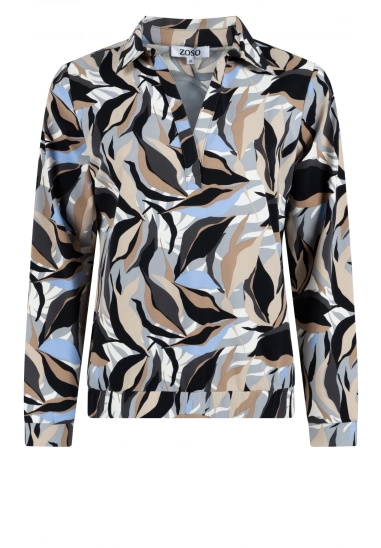 Blouse Jennifer voor dames van het merk Zoso. De blouse heeft een mooie multicolour allover print en gemaakt van een hele mooie kwaliteit travel stof. De blouse heeft een kraag en een elastische band aan de onderzijde. Verkrijgbaar in een zwart, beige, ivoor en blauwe kleurencombinatie.