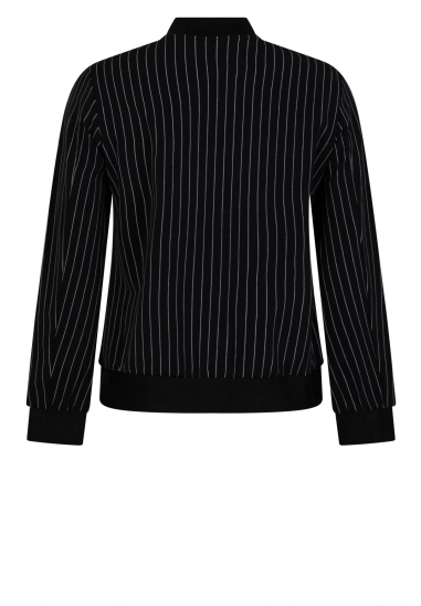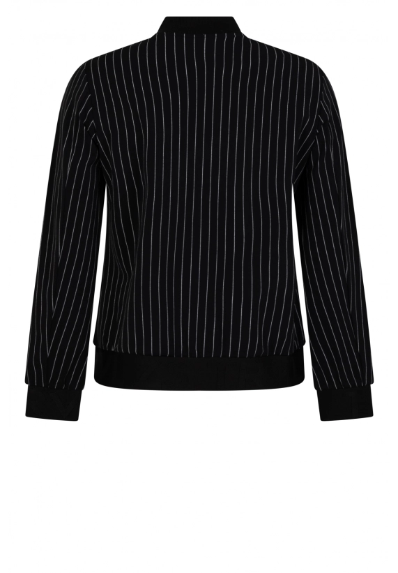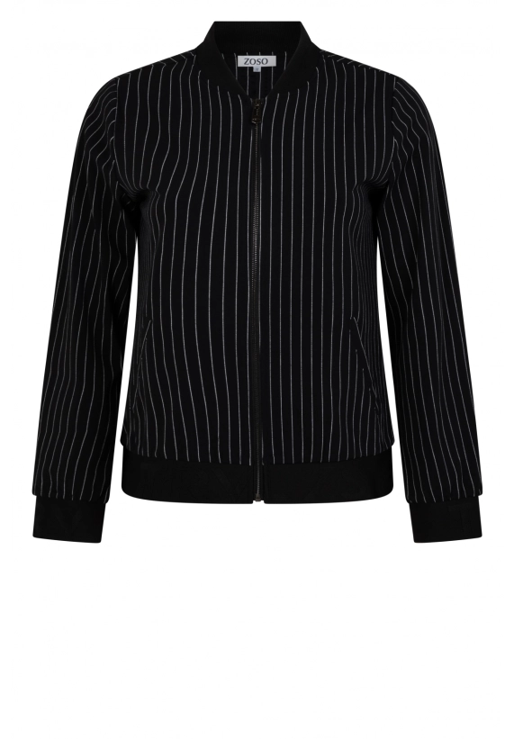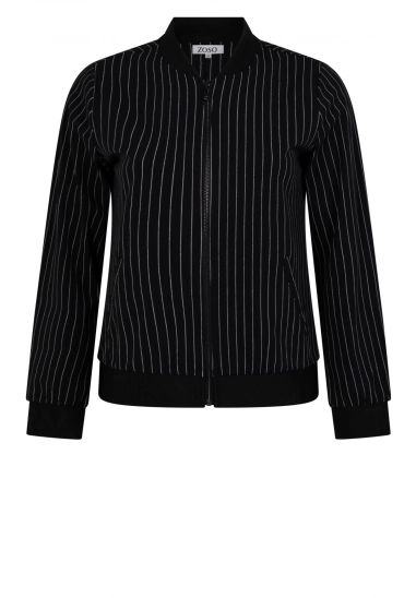 Krijtstreep bomberjasje Linda voor dames van het merk Zoso. Het jasje is gemaakt van een hele mooie kwaliteit travel stof. Verkrijgbaar in het zwart met een witte fijne streep.