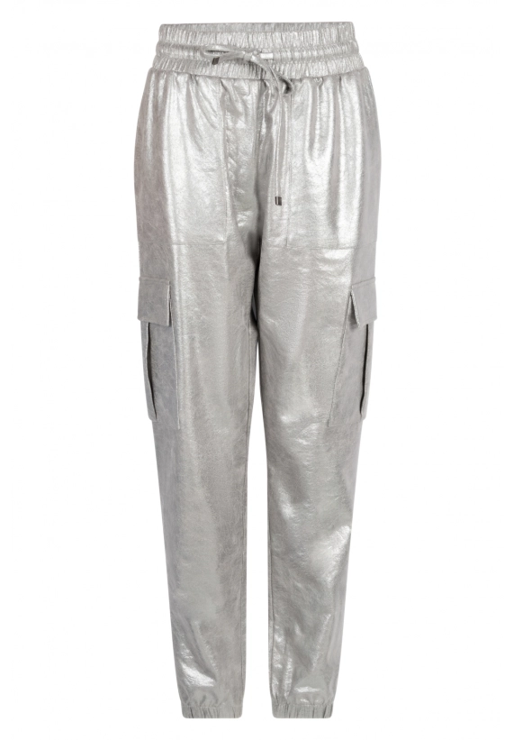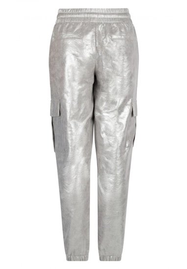Suedine broek Michelle voor dames van het merk Zoso. De broek heeft een mooie glans, een elastische band en zijzakken. Verkrijgbaar in het zilver.