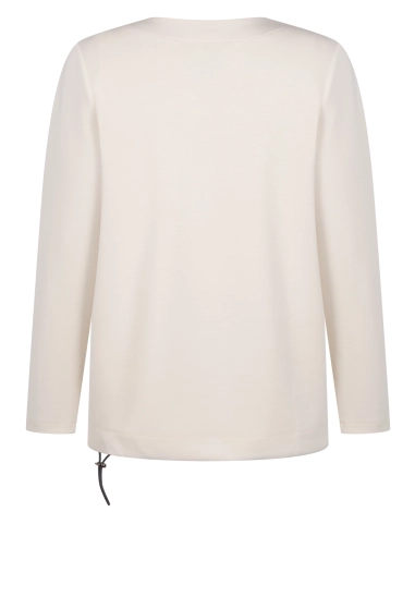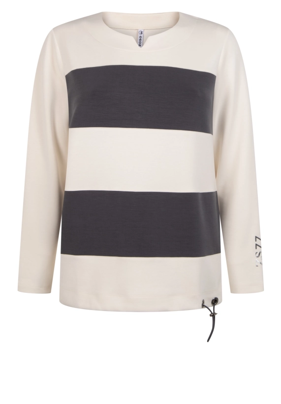 Sweater Tess voor dames van het merk Zoso. De sweater heeft een cut and sew streep en verkrijgbaar in het ivoor wit met antraciet.